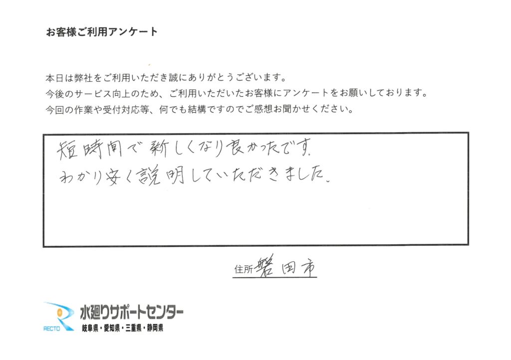 静岡県磐田市のお客様より、浴室の蛇口が水漏れしているので来てほしいと、水漏れ修理依頼をいただきました。浴室の蛇口はユニットバスのカウンターに付いている、台付の混合栓でした。このタイプの蛇口はだんだんと種類が減ってきております。今回新しく交換させていただいた蛇口は、吐水口(水の出る首の部分)が伸び縮みする便利な蛇口です。温度調節機能が付いているサーモ付き混合水栓です。新品のピカピカの蛇口は気持ちいいですね。