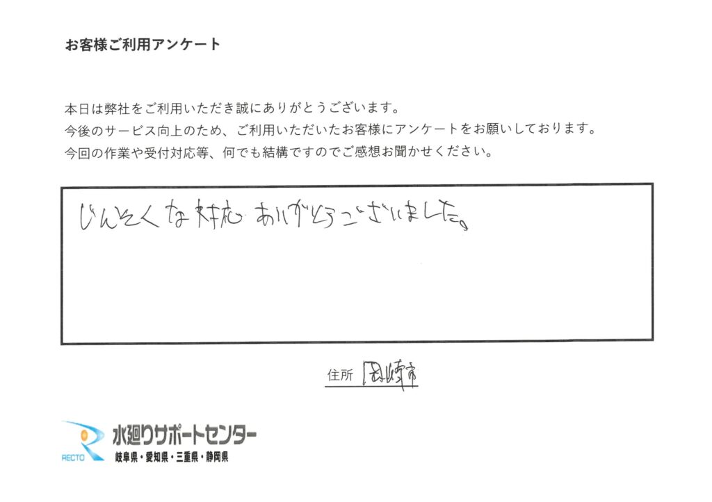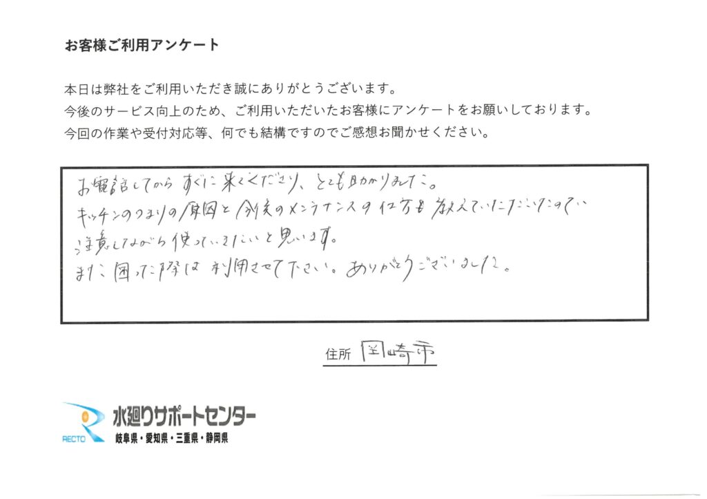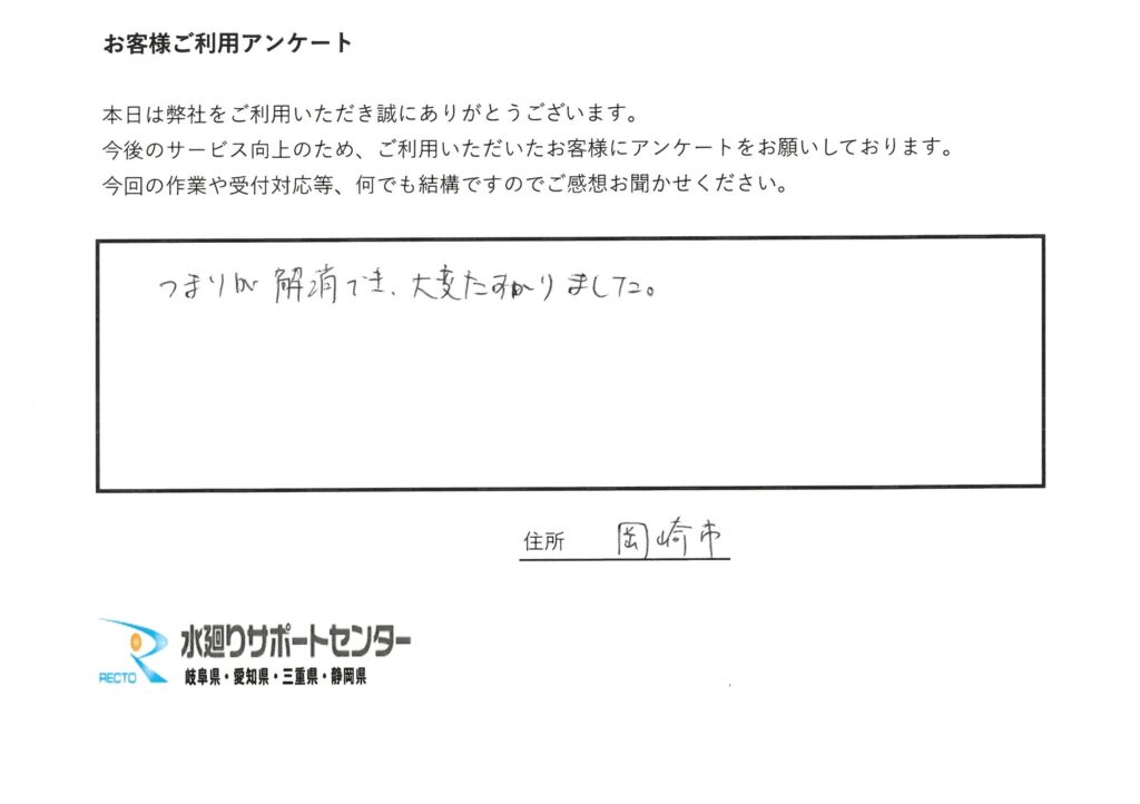 愛知県岡崎市 O様 つまりが解消でき、大変助かりました。