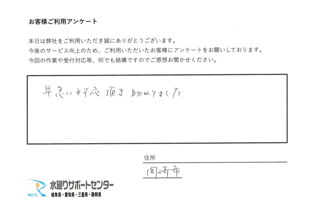 愛知県岡崎市 T様 早急に対応頂き助かりました。