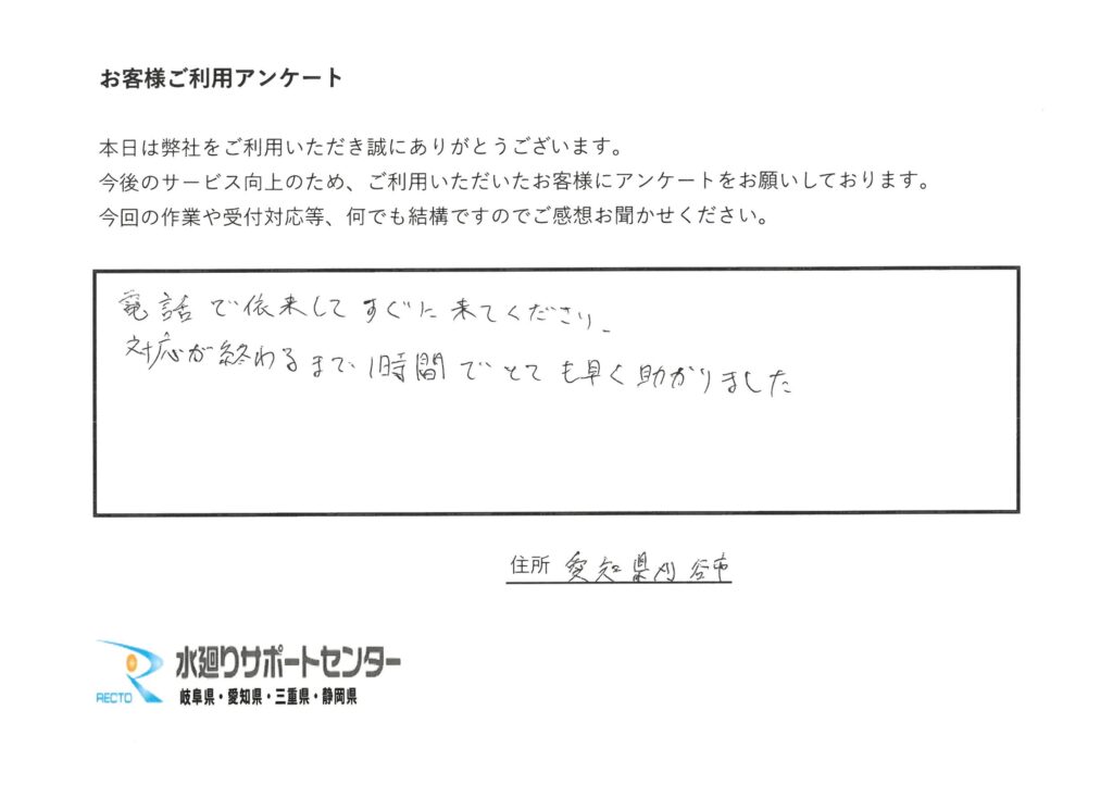 愛知県刈谷市 W様 とても早く助かりました。