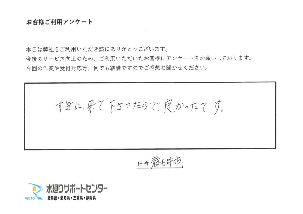 愛知県春日井市 K様 すぐに来て下さったので良かったです。