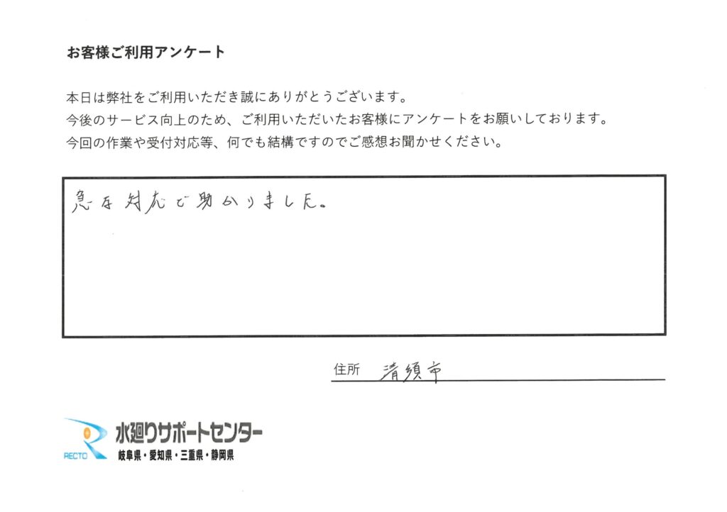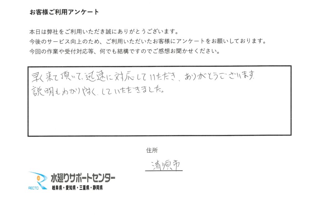 早く来て頂いて迅速に対応していただきありがとうございます。
