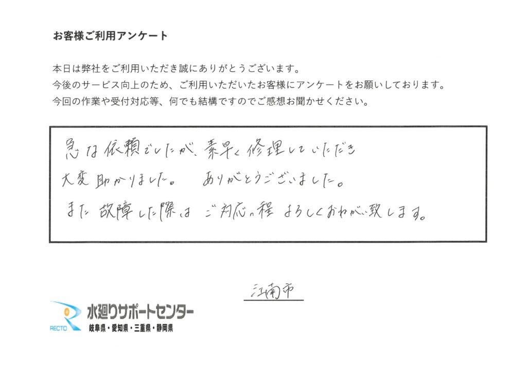 水廻りサポートセンターは江南市の水道局より認定を受けた工事店「水道局指定業者」です。国が定めた基準に従い正しく施工できることを認められ非認定業者にはできない工事も可能です。