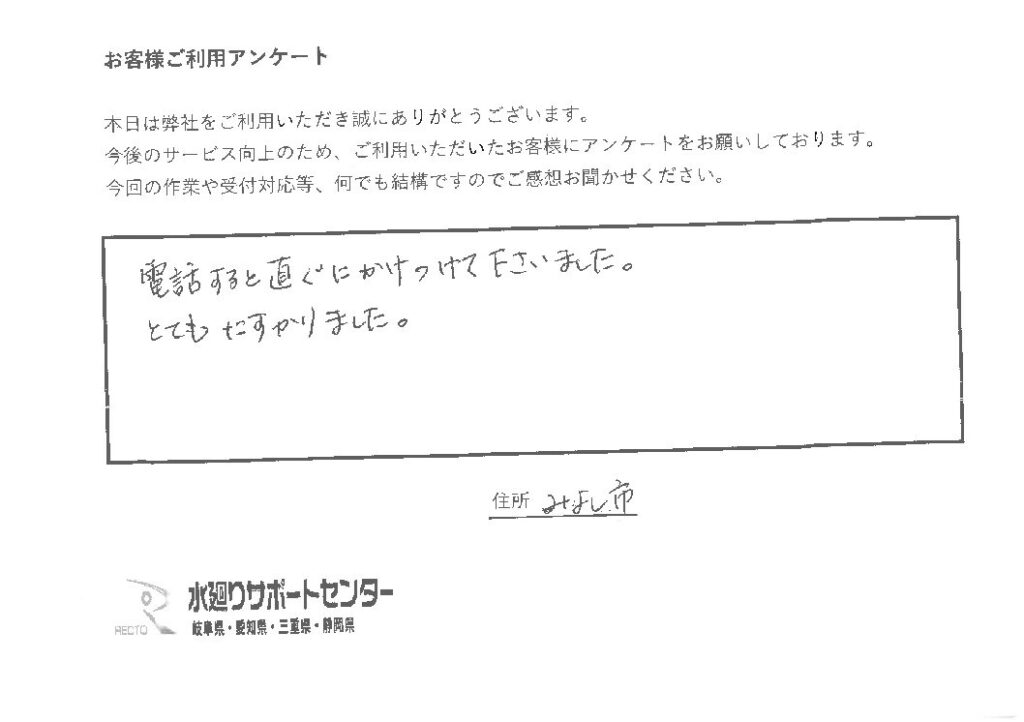 愛知県みよし市 S様 電話をすると直ぐにかけつけて下さいました。