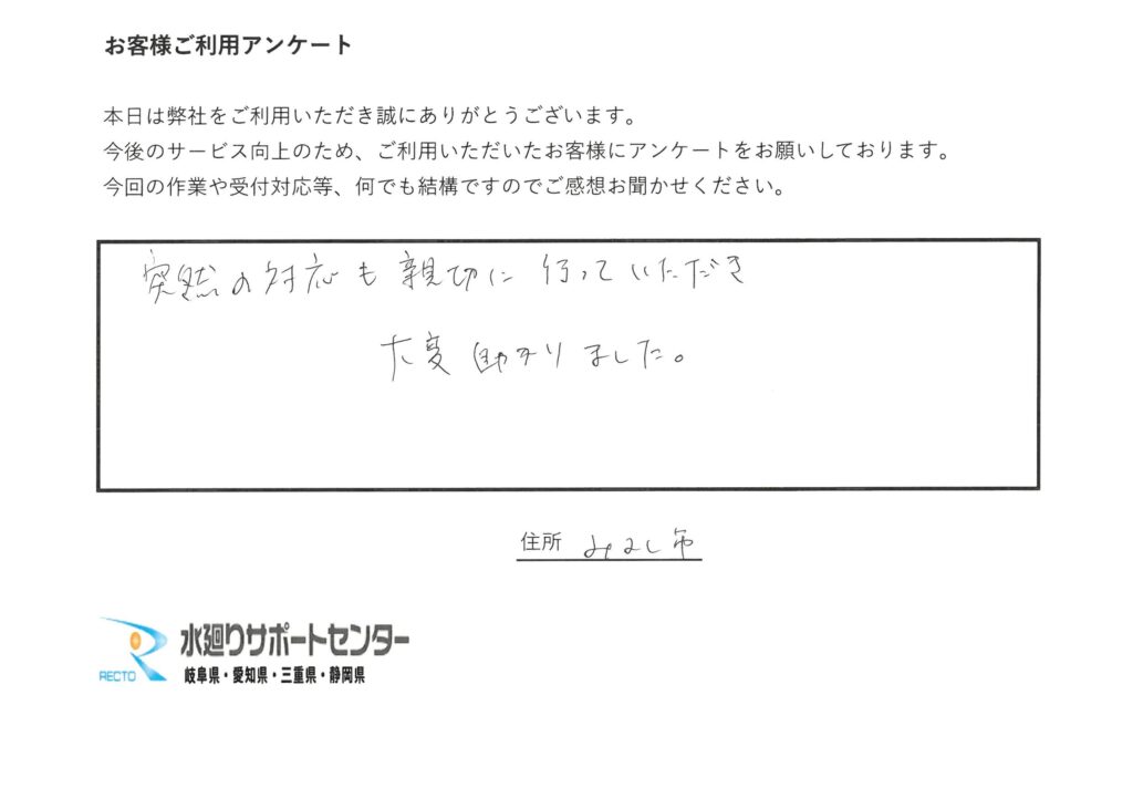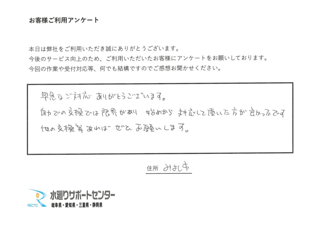 愛知県みよし市 O様 突然の対応も親切に行っていただき大変助かりました。