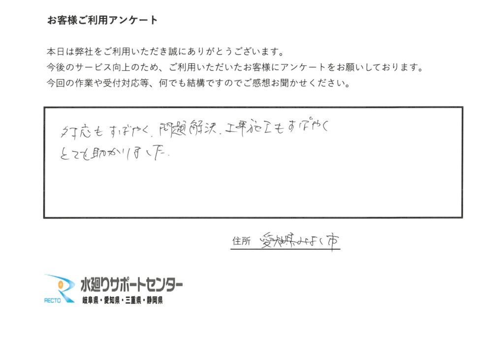 愛知県みよし市 H様 対応もすばやく問題解決、工事施工もすばやくとても助かりました。