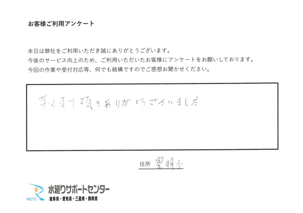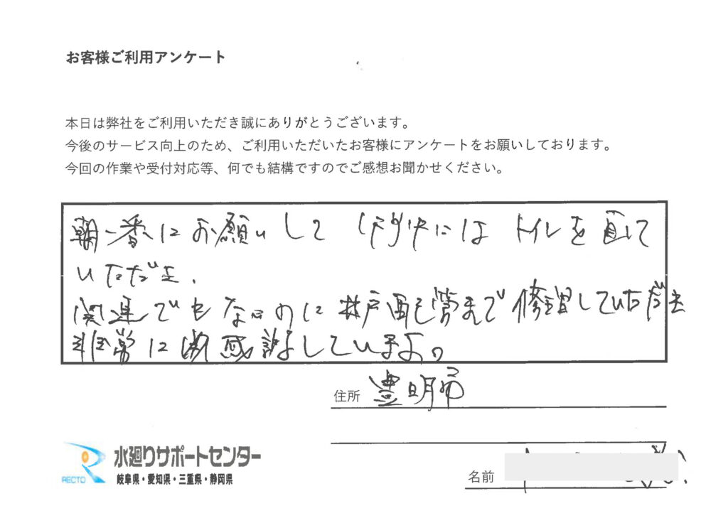 朝一番にお願いして午前中にはトイレを直していただき、関連でもないのに井戸配管まで修理していただき非常に感謝しています。