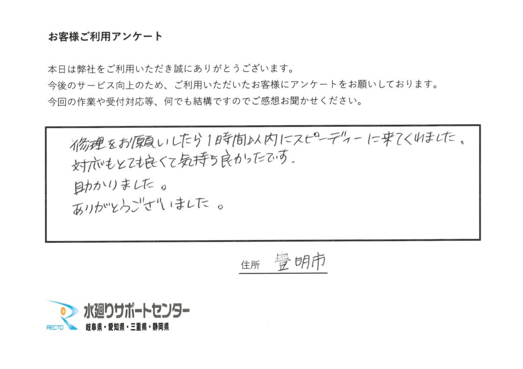 修理をお願いしたら1時間以内にスピーディーに来てくれました。