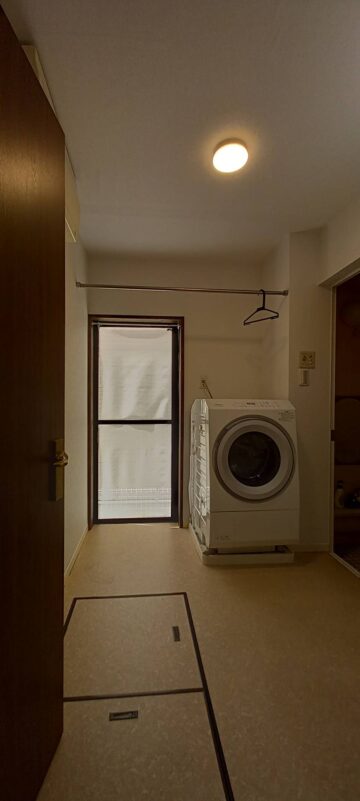 作業内容 | 勝手口既存枠撤去、枠側壁捲り工事、枠施工工事、壁・天井クロス張替工事、洗面化粧台(TOTO三面鏡 750幅 Vシリーズ)交換工事、電気工事 |