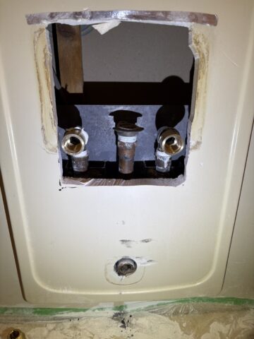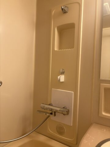 | 作業内容 | カウンター、棚、洗面ボウルカバー脱着、配管調査 ユニットバス壁開口 既設シャワーバス水栓配管撤去(切断)給水、給湯工事 サーモスタット付シャワーバス水栓(TBV03401J1)化粧フタ、化粧プレート取付 化粧板加工取付、コーキング シャワーフック壁加取付 洗面ボウル排水管取替 壁パネルコーキング |